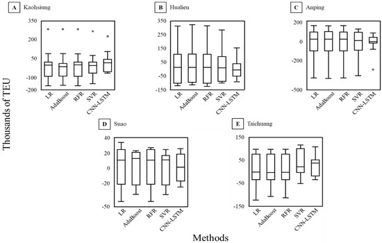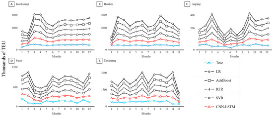 The outcomes obtained through metrics and statistical tests represent the performance of different models. In Figure 8A, the x axis denotes the time (January–December, 2019), and the y axis denotes container throughput, presented in thousands of twenty-foot equivalent units (TEU). The cross-trend line denotes the ground truth. Prediction outcomes of different models are indicated as follows: CNN–LSTM (triangle), SVR (circle), RFR (plus), AdaBoost (rectangle), and LR (diamond). We visualized the forecasted value and the actual value to understand the difference between the predicted and actual trends. The subfigures (A) Kaohsiung, (B) Hualien, (C), Anping, (D) Suao, and (E) Taichung highlight that the value predicted by CNN–LSTM (denoted by the red line) is the closest to the actual value and trend. Although other methods yielded similar trends, they were far from the actual trend.