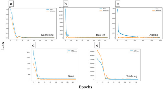 In the model training process, a validation set can be used to evaluate whether model overfitting occurred. Generally, after the performance of the validation set becomes stable, if the training continues, the loss of the training set will continue to improve, but the efficiency of the loss of the validation set will deteriorate, which indicates that the model is overfitting. Hence, the validation set can also be used to determine when to stop training. We considered 10% of the training set as the validation set. Figure 10 shows that the trends of the validation set of the container throughput data are stable according to the training result obtained using the proposed method. In most cases (Kaohsiung (Figure 10a), Hualien (Figure 10b), Suao (Figure 10d), and Taichung (Figure 10e)), the trend of the validation set was stable before 100 epochs. For Anping (Figure 10c), the trend of the validation set was stable at approximately 600 epochs.