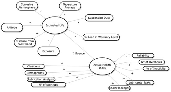 The Current Health Index is calculated according to Equation (9), and the time variable (t) corresponds to the elapsed time registered by the company since the first start-up of the equipment after an overhaul. As mentioned above, each age recorded corresponds to one calendar month of operation, counting the working hours until the end of its life cycle, i.e., until the compressor is again put out of service to overhaul. Figure 1 shows a cognitive map that depicts the influence of the various factors affecting the life of an asset: the arrows labeled with a positive sign indicate a direct relationship—i.e., as the factor increases, the index will increase—while those arrows labeled with a “-“ indicate an inverse influence relationship—i.e., as the factor increases, the index will tend to decrease or vice versa.