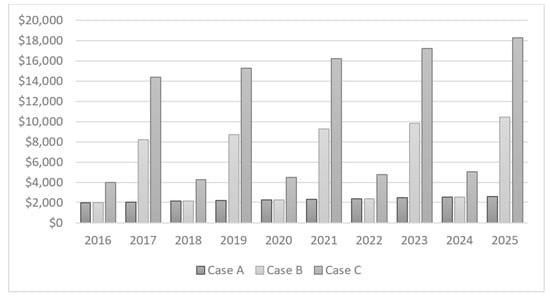 Figure 3 clearly shows the difference in costs due to low reliability for each year caused by the variation in the failure rate, confirming the hypothesis stated above: by isolating the total costs due to failures, it is possible to appreciate the effect caused by the deterioration processes, among other factors, in the failure rate and consequently the difference in costs, despite the fact that, in this particular case, the Life Cycle Cost is not greatly affected.