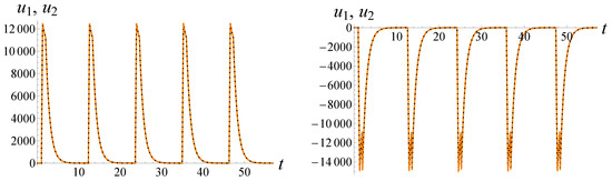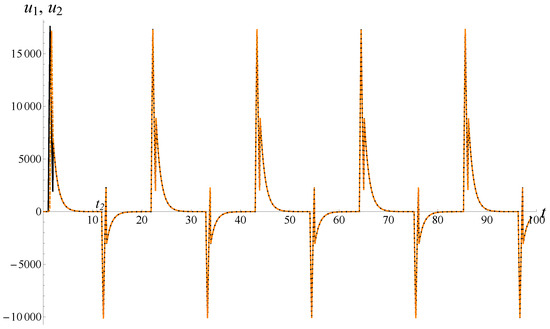 Example of solution. Values of parameters: , , , = 10,000. Black line—, orange dashed line—.