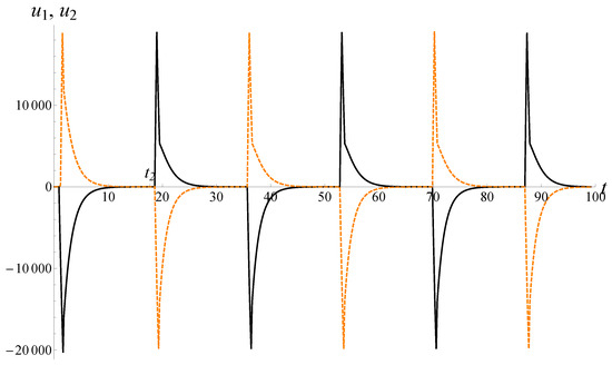 First, consider the case . From Formulas (29), (30), and (32), we obtain that components and have the same leading terms of asymptotics on the interval and that these leading terms of asymptotics do not depend on . Thus, from Formulas (9), (10), (12), (29), (30) and (32), we obtain that the leading term of asymptotics of solution of system (3) depends on only for (see Figure 4). From Corollary 4, we get that in the case difference has order at for all , so we may say that in the case oscillators and “synchronize” (for smaller values of oscillators and may “synchronize”, too, but in the case they must “synchronize”).