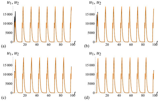 Solutions of system (3) for different values of parameter . Values of parameters: , , , , , (a) ; (b) ; (c) ; (d) . Black line—, orange dashed line—.