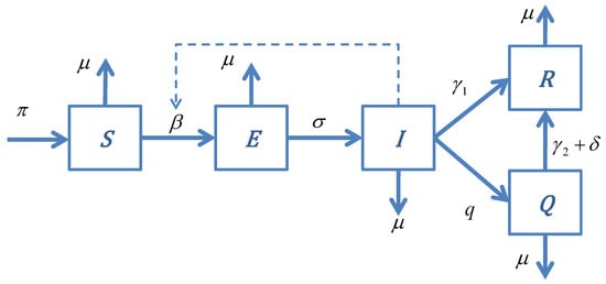 We assume that all individuals that are at risk of acquiring the infection belong to the subclass S. When a susceptible individual comes in contact with an infectious individual, s/he may become exposed at the rate . We consider density dependent transmission here, hence susceptible individuals transfer to exposed class is modeled as . The exposed individuals are considered to have latent infections and cannot infect others. Here, we assume that the isolated individuals are held strictly quarantined and do not transmit the disease. They start transmitting the disease after a few days and move to the infectious subclass I at the rate . Due to not expressing symptoms, inadequate testing facilities and widespread outbreak, it is considered that all the infected patients are not identified. We assume that the infectious individuals may be identified and isolated at an expected rate q and move to isolated subclass Q, or maybe recovered and move to the subclass R at the rate . The isolated individuals recover at an average rate of and are assumed not to transmit the disease. The parameter represents the rate of immigration due to birth. The parameters and represent the intrinsic death rate and disease related death rate, respectively. It is to be noted that, we assume all the severe cases are identified, as they seek for medical treatment due to the severity. Further, disease related deaths are mostly associated with severe cases [31,32]. So, we assume no disease related death rate in compartment I. The above mentioned transmission mechanism is summarized in the following system of differential equations. The flow of individuals between compartments are illustrated graphically in Figure 1.