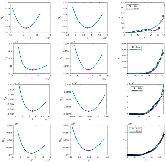 Figure 3 shows the model fitting with the reported data on the time intervals starting from to = 30, 50, 70 and 90 days, respectively. The blue curves in the first and second column shows the profile likelihood of and q respectively, for each of which one of the parameters are set to the value re-tuned by the minimization algorithm and the other is varied over the interval shown on the horizontal axis. The pattern of the profile likelihood affirms the identifiability of the parameters. The red dots in the first two columns show the best fit for the parameters and q, whereas the third column shows the agreement between the model and data corresponding to these and q.