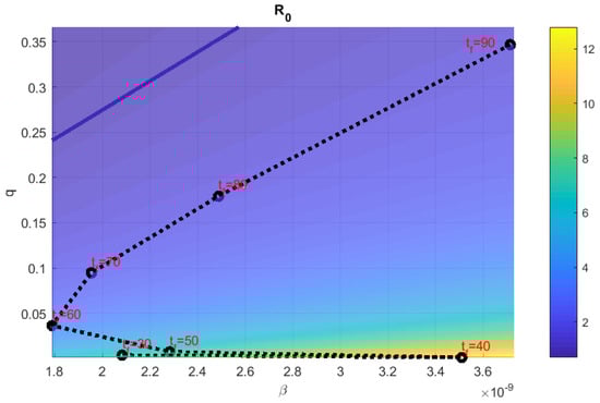 To understand the relationship better, we plot as a function of and q in Figure 5, which clearly shows that increases with an increasing and a decreasing q. The black dotted line shows the evolution of in space, a high is observed corresponding to a high at the beginning. Although was high afterwards, increasing q is observed to act predominantly to decrease the value of . The solid line in the top left corner shows the threshold , above which the combination and q gives , resulting in no outbreak, which agree with the mathematical analysis presented in Section 2 more specifically Theorem 2 (a). The value of and q can be controlled to reduce below 1, which will curve the epidemic.
