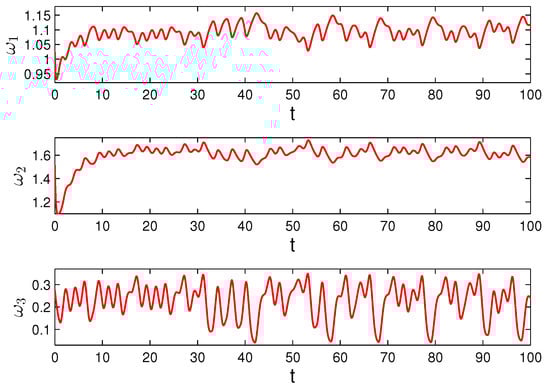 and The function is unpredictable in accordance with Lemmas 3 and 4. The conditions (C1)–(C8) hold for the network (23) with It is not difficult to calculate that Consequently, there exists the unpredictable solution, of the system. Since it is not possible to indicate the initial value of the solution, we apply the property of asymptotic stability, since any solution from the domain ultimately approaches the unpredictable oscillation. That is, to visualize the behavior of the unpredictable oscillation, we consider the simulation of another solution. We shall simulate the solution with initial conditions