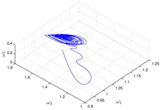 Thus, if then and we can say that the graphs of the functions match visually, since they have technical conditions [37]. In other words, what is seen in Figure 1 and Figure 2 for a sufficiently large time can be accepted as parts of the graph and trajectory of the unpredictable solution. Both of the figures reveal the irregular dynamics of system (23).
