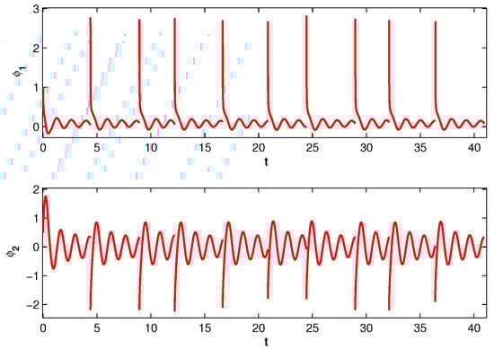 where . Inequality (5) is satisfied for system (23) with and . According to Theorem 2, there exists the unique asymptotically stable discontinuous unpredictable solution of system (23).