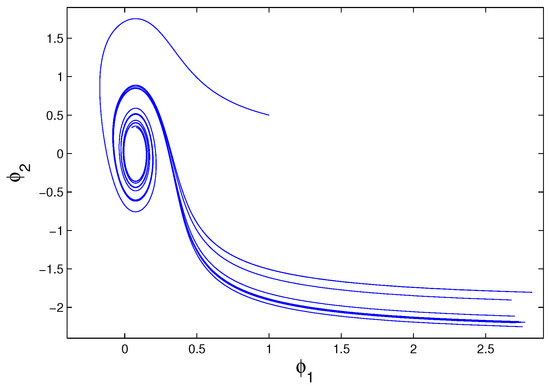 It is worth noting that the simulation of an unpredictable function is not possible, since the initial value is not known. That is why, we will simulate a solution which approaches to the unpredictable solution as time increases. Instead of the curve describing the unpredictable solution, one can take the graph of . We depict in Figure 2 the graph of the solution with initial values . Moreover, Figure 3 presents the orbit of the solution .