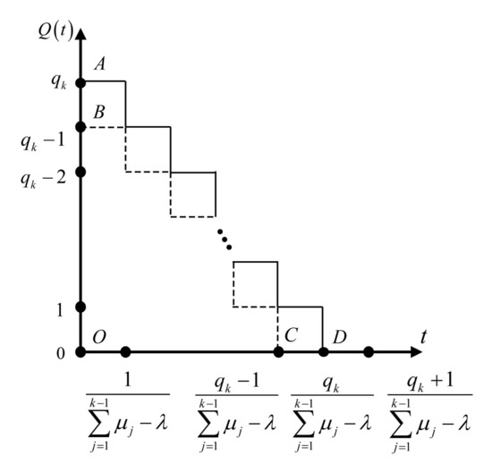 We now explain how this fluid model can be employed for our aim. Assume that is an optimal threshold to allocate the customer to server k in state , where the first servers are busy. Now we compare the queues of the system given initial state is , where the kth server is not used for a new customer, and , where the kth server is occupied by a waiting customer. It is assumed that the stability condition holds. In Figure 2, the queue lengths are labeled by and . If the queue dynamics corresponded to the deterministic fluid, it would decrease at the rate . When this rate is maintained until the queue is empty, it occurs respectively at points and . The total holding times of customers in a queue with lengths and are equal obviously to the areas