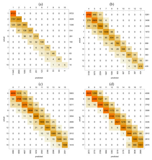 and evaluate with HS for the corresponding thresholds , . Confusion matrices in Figure 3 visualize the performance of proposed heuristics respectively for the threshold levels . Each row of these matrices represents the instances in a predicted value while each column represents the instances in an actual value. We notice the heavily diagonally dominant matrices that indicates a very good classification. This fact is confirmed also by overall accuracies. Such metrics describe the closeness of the heuristic measurements to a real threshold value and are calculated through the ratio of correct predictions to total predictions. Calculations of the overall accuracies as well as the accuracies for results with an acceptable deviation of threshold values by from the real value are summarized in Table 1.