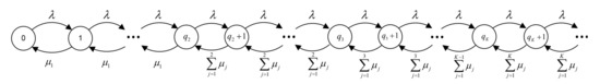 In this diagram the group of states with a certain number of busy servers are labeled by according to the number of busy servers in a state. An analytical solution for the heterogeneous queueing system with the FSF policy, where all states of servers are taken into account, although possible, but it is limited by the number of servers in the system. The latter system can be approximated in turn by a heterogeneous system with a preemption with appropriate evaluated service rates , . The dynamics of the system is described by the continuous-time Markov-chain with a state space , where specifies the number of customers in the system at time t. The state transition diagram for this Markov-chain is presented in Figure 6.