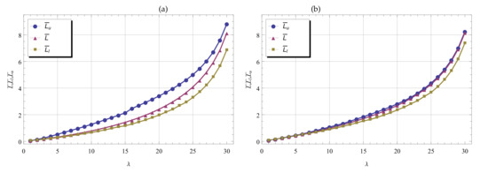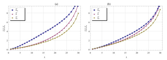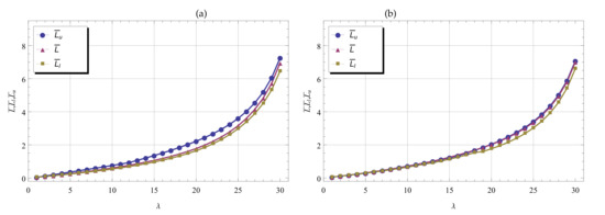 In Figure 7, Figure 8 and Figure 9 we display the values with bounds and calculated respectively by the policy-iteration Algorithm 1 and by expressions (15) and (17) as functions of λ and number of servers . The Gini’s index in a figures labeled by (a) and —by (b). The curves in figures show, that the mean number of customers as well as the size of the gap between the lower and upper bounds increases with increasing values of K. As expected, the low and upper bounds must coincide with a mean value for the system with homogeneous servers, where . Indeed, in figures with less heterogeneity of servers the curves for and are getting closer, as the Gini’s index decreases. Moreover, we notice that the functions take similar values in a light traffic case when and tend to the same values as the traffic becomes heavier, i.e., if .
