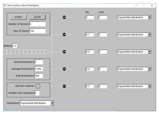 For this specific implementation it is possible to set the number of servers, the buffer capacity, threshold levels (limits), the arrival and service rates. The customers are indicated by a black circle, and are numbered accordingly to their arrival times. On the graphical interface there are also fields that show the actual amount of customers in the system, the average number and the total number of customers in the system including the already processed customers, the number of lost customers due to the truncated buffer capacity. The stability condition is taken into account and the buffer size is big enough so there should be hardly any lost customers. Hence the results with a truncated queue are comparable to systems with infinite queue lengths. Unfortunately, simulations are also unfit to solve systems with a large number of servers and states, as one would need to simulate a large number of different configurations with thousands of customers to get acceptable results. This fact further confirms the relevance of the results obtained in the previous sections.