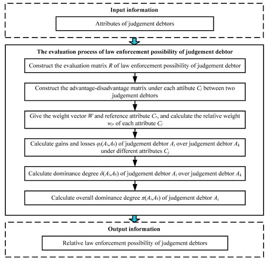 Therefore, a novel hybrid TODIM method for evaluating the law enforcement possibility of the judgment debtor is developed. The main idea of the hybrid TODIM method to evaluate the law enforcement possibility of judgment debtors is to obtain the relative possibility value of judgment debtors by comparing the attribute values between two judgment debtors and aggregating the differences of all the attributes. Specifically, the gains and losses between two judgment debtors are calculated under different attributes, the dominance degree value of judgment debtors is given by aggregating the gains and losses of all the attributes, and the relative law enforcement possibility of the judgment debtor is calculated by the overall prospect value. The evaluation process is shown in Figure 1.