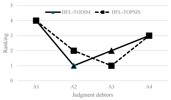 To compare the evaluation results of the hybrid TODIM method and the hybrid TOPSIS method on the law enforcement possibility evaluation of judgment debtors, the evaluation results of the two methods are shown in Figure 2. It can be seen that the performance evaluation results of the hybrid TODIM method are different from those of the hybrid TOPSIS method. The largest law enforcement possibility obtained by the hybrid TODIM method was A2, while that of the hybrid TOPSIS method was A3. The main reason for the different results is that the hybrid TODIM method fully considers the psychological and behavioral factors of law enforcement officers in the evaluation process of law enforcement possibility, and the evaluation results are more in line with the actual situation. Meanwhile, the hybrid TOPSIS method is based on the assumption that law enforcement officers have complete rationality in the evaluation of the judgment debtors and fails to fully consider the law enforcement officers’ psychological and behavioral factors. Therefore, the hybrid TODIM method is more reasonable, accurate, and reliable than the hybrid TOPSIS method.