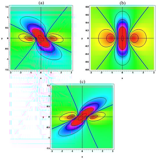 where and signify the horizontal and vertical velocities for the rational localized wave, respectively. The signs of determine the direction of propagation along the y-axis. In addition, the condition suggests that the rational localized wave (24) cannot be converted into a line localized wave [16]. What is more, it is easy to see from the straight line (27) that the inclined direction of the propagation trajectory to the x-axis is determined by the signs of : if , then , and the propagation trajectory passes through the first and the third quadrant in the -plane; if , then , and the propagation trajectory passes through the second and the forth quadrant in the -plane; if , then and , and the propagation trajectory is the y-axis. However, the symmetries of the rational localized wave are determined by the signs of : if , the rational localized wave leans to the right in the -plane; if , the rational localized wave is an axisymmetric graphic; if , the rational localized wave leans to the left in the -plane. Figure 1 illustrates three examples of the rational localized wave, and one of them represents a symmetrical rational localized wave with (Figure 1b), and another two are the skew rational localized wave figures with (Figure 1a,c). In Figure 1a, the rational localized wave leans to the left in the -plane. In Figure 1c, the rational localized wave leans to the right in the -plane. Therefore, according to the relations between and , we can come to the following conclusions: