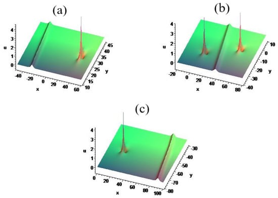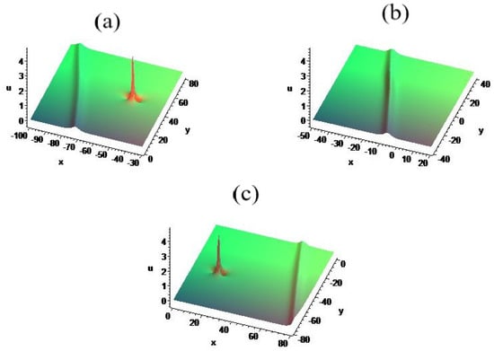 Figure 2 and Figure 3 display two different interactions between a rational localized wave and a line soliton. As can be seen from Figure 2, when , the interaction solution determined by (31) describes the propagation of two separate localized waves; see Figure 2a. Interestingly, with the development of time, when two localized waves get close to each other, we observe that the slow rational localized wave gradually is absorbed by the right side of the fast line soliton. Two localized waves fuse to one line soliton; see Figure 2b. However, some time later, gradually, the slow rational localized wave is emitted from the left side of the fast line soliton; see Figure 2c. This interaction phenomenon can be referred to as an absorb-emit interaction phenomenon. Figure 3 is quite distinct from Figure 2. When , away from the interaction region, the interaction solution describes the propagation of two individual localized waves; see Figure 3a. More interestingly, with time evolution, when two localized waves come together, we find that a new rational localized wave gradually is emitted from the left side of the fast line soliton. Three localized waves are displayed; see Figure 3b. However, some time later, gradually, the original rational localized wave is absorbed by the right side of the line soliton; see Figure 3c. This interaction phenomenon can be referred to as an emit-absorb interaction phenomenon. These interactions are completely different from the completely non-elastic interaction between a rational localized wave and a line soliton in References [17,18].
