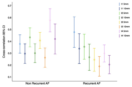 The cross-correlation coefficient and time lag between time series were calculated between dipoles located in each PV, between dipoles located 5 mm and 10 mm distance to each other in sequential moments, previous to electrical isolation of each pulmonary vein. Results show that, in patients without recurrences in the arrhythmia the correlation increases during the ablation procedure, and in patients that had long-term recurrences in the AF, the correlation between dipoles does not increase (Figure 4). The global differences between both groups showed statistically significant differences vs. in non-recurrent AF and recurrent AF groups, respectively (p = 0.013).