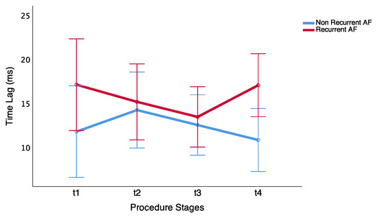 Finally, we observed statistical significance in time-lag differences between both groups before the last ablation procedure stage (t4) ms vs. ms in the non-recurrent AF and recurrent AF groups, respectively (p = 0.017). Thus, delay differences showed differences at closer inter-dipole distance in the patients that maintain sinus rhythm (Table 4).