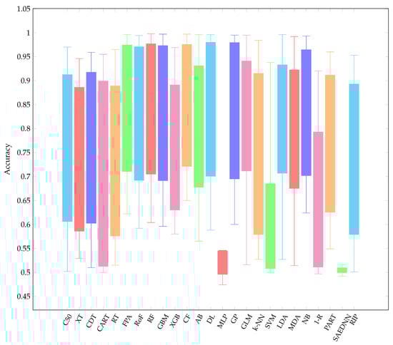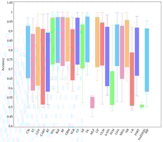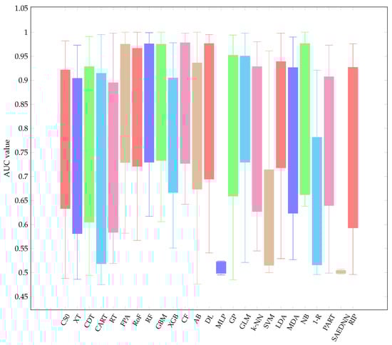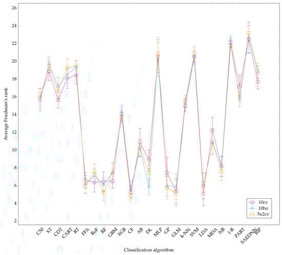 To maintain the readability of this paper, all performance results are provided in Appendix B. In Figure 3, Figure 4 and Figure 5, the AUC value of each classification algorithm for each validation method is firstly shown. The boxplots show the distributions of data according to the AUC values obtained for each dataset. More specifically, they indicate the performance variability of classification algorithms relative to each dataset. The mean AUC values are grouped based on each resampling technique. It can be observed that there is a greater variability for FPA, RoF, RF, GBM, SVM, LDA, AB, and 1-R, regardless of validation methods considered. On the other hand, MLP and SAEDNN have less variability, meaning that such classifiers’ performances are consistent, in spite of the clinical dataset used. Overall, the six best-performing algorithms (in descending order of mean AUC value) are apparently CF, RF, FPA, RoF, DL, and GBM. Furthermore, since simply taking the average performance value might lead to bias, a Friedman ranking is adopted for assessing the classifier’s performance (see Figure 6). Instead of analyzing the explicit performance, Friedman rank analysis is based on the rank of each classifier on each dataset. To address the RQ, we analyze the relative performance of classifiers in different resampling strategies using the Friedman rank. With reference to 10cv, the Friedman rank can confirm that the six top-performing classifiers, in ascending order, from the best-performer to the worst performer are LDA, CF, GLM, RoF, RF, and GBM with average rank 5.04, 5.21, 5.32, 6.32, 6.46, and 6.47, respectively.