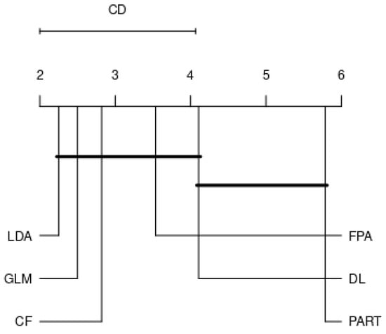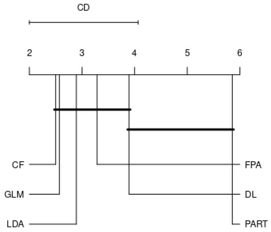 - A non-parametric Friedman test [69] is exploited to inspect whether there exist significant differences between the classifiers with respect to the performance metrics as mentioned earlier [70]. The null hypothesis (): no performance differences between classifiers exist, i.e., the expected difference that is equal to zero is observed against the alternative hypothesis (): at least one group of classifiers does not have the same performance, i.e., the expected difference is not equal to zero. The statistic of the Friedman test is calculated according to Equation (1):