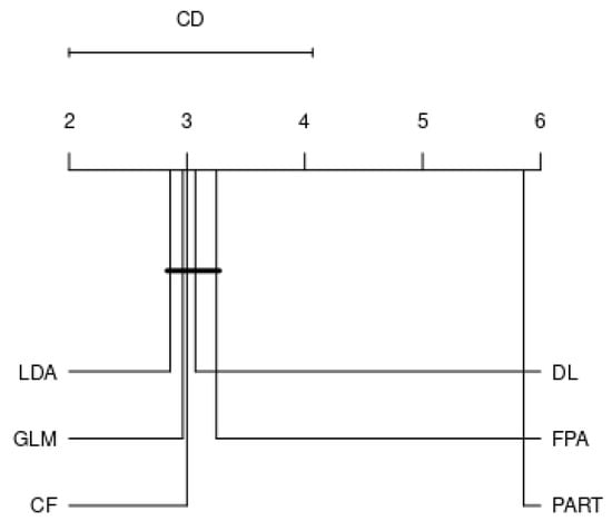 According to Friedman rank and 10ho, the top-5 superior performers are CF, followed by DL, GLM, GP, and LDA with average rank 5.61, 5.82, 5.86, 5.93, and 5.96, respectively. Subsequently, with respect to 5 × 2cv, CF is on the topmost performance with average rank 4.82. This is succeeded by GLM, RF, GP, and LDA, with average rank 5.11, 5.14, 5.71, and 5.89, respectively. For the sake of an inclusive evaluation, the behavior of the top-performing classifiers can be discussed as follows: