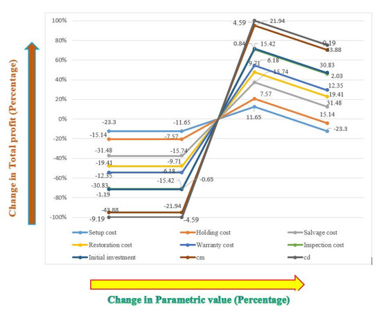 The relationship among the key parameters and total profit is extensively discussed in this section, wherein the effect of parameters such as , , , , , , , , and b on the optimal solution is determined. The effect of the parameters is summarized in Table 6. Here, the graphical presentation in Figure 3 expresses the effect of parameters on the total profit.