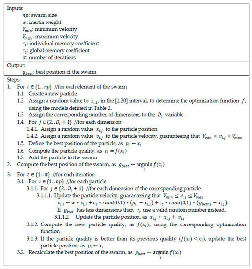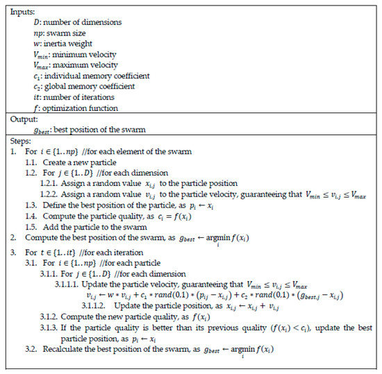 The pseudocode of the PSO algorithm described by Shi and Eberhart [55] is shown in Figure 1. It assumes that it is intended to minimize an objective function.