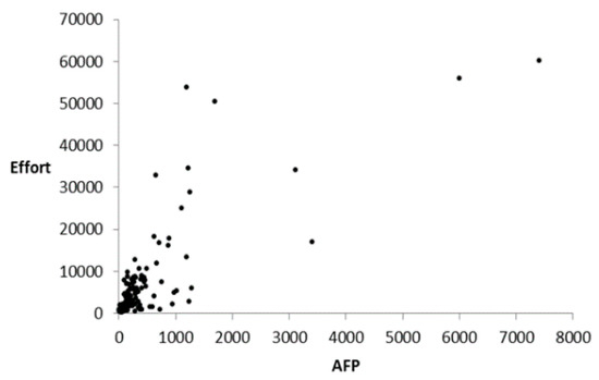 The size of a software project is a common variable used for SDEP [3], therefore, our models use it as the independent variable. In our study, the size type is function points, whose value is calculated from nineteen independent variables mentioned in the Section 4 of the present study (i.e., adjusted function points, AFP) [13].