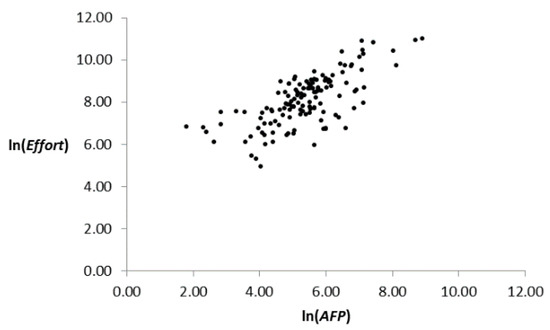 Table 4 classifies those final 2034 new and enhancement projects classified in accordance with criteria included in Table 3. Since the χ2 statistical normality test to be applied in this study needs at least thirty data, a scatter plot (Effort vs. AFP) was generated by data set whose number of projects in Table 4 was higher or equal than thirty (i.e., fifteen data sets). The scatter plots of these fifteen data sets from the Table 4 showed skewness, heteroscedasticity, and presence of outliers, therefore, in Table 5 four statistical normality tests are applied for Effort and AFP variables. Table 5 shows that there is at least a p-value lower than 0.01 by data set. It means that can be rejected the idea that Effort and AFP come from a normal distribution with 99% confidence for all of the data sets. Therefore, data are normalized applying them the natural logarithm (ln), which ensures that the resulting model goes through the origin on the raw data scale [43]. As example, Figure 4 and Figure 5 depict those scatter plots corresponding to that data set of Table 4 having 133 new software projects. Figure 4 and Figure 5 depict the raw and transformed data, respectively.