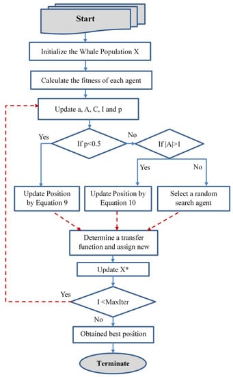 In the classical WOA, whales move inside the continous search space in order to modify their positions, and this is called the continuous space. However, to solve FS issues, the solutions are limited to only values. In order to be able to solve feature selection problems, the continuous (free position) must be converted to their corresponding binary solutions. Therefore, two binary versions from WOA are introduced to investigate problems like FS and achieve superior results. The conversion is performed by applying specific transfer functions, either the S-shaped function or V-shaped function in each dimension [63]. Transfer functions show the probability of converting the position vectors’ from 0 to 1 and vice versa, i.e., force the search agents to move in a binary space. Figure 1 demonstrates the flow chart of the binary WOA version. Algorithm 1 shows the pseudo code of the proposed bWOA-S and bWOA-V versions.