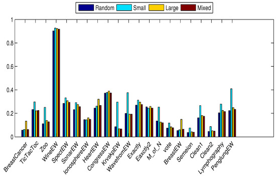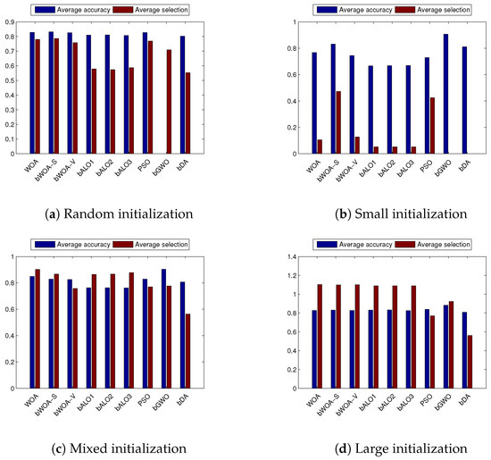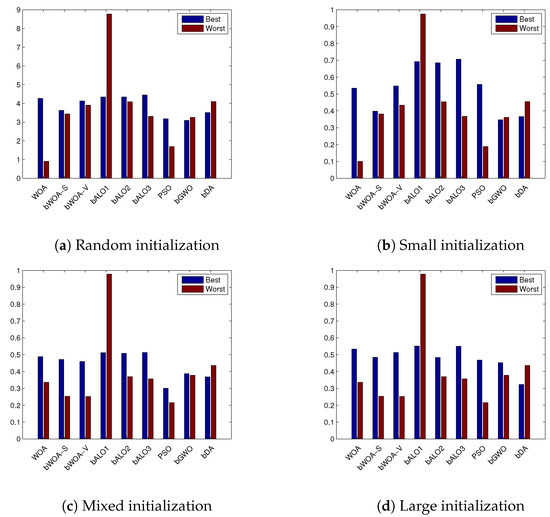 Moreover, Figure 4 outlines the best and worst acquired fitness function value averaged over all the datasets, using small, mixed and large initialization. Figure 5 shows the classification accuracy average. From these figures, it can be proven that the bWOA-V performs better than other compared algorithms, such as PSO and bALO, which confirms bWOA-V’s searching capability, especially in the large initialization.