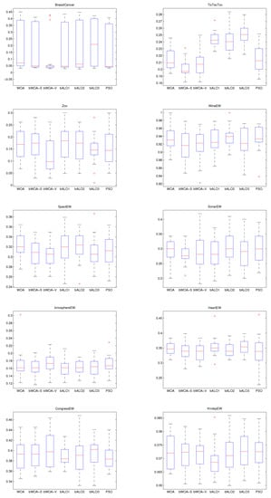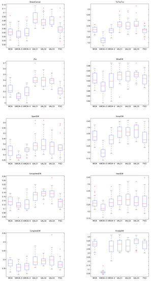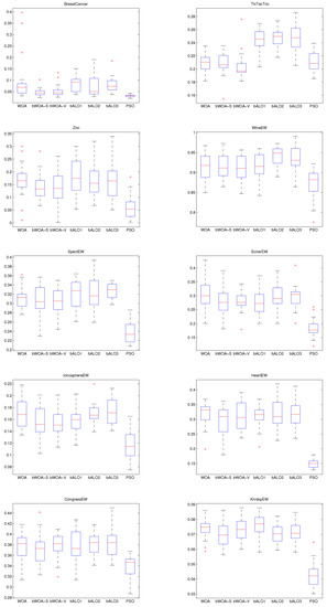 In order to show the merits of bWOA-S and bWOA-V qualitatively, Figure 6, Figure 7 and Figure 8, show the boxplots results for the three initialization methods obtained by all compared algorithms. According to these figures, bWOA-S and bWOA-V have superiority since the boxplot of bWOA-S and bWOA-V are extremely narrow and located under the minima of PSO, bALO, and the original WOA. In summary, the qualitative results prove that the two proposed algorithms are able to provide remarkable convergence and coverage ability in solving FS problems. Another fact worth mentioning here is that the boxplots show that bALO and PSO algorithms provide poor performance.