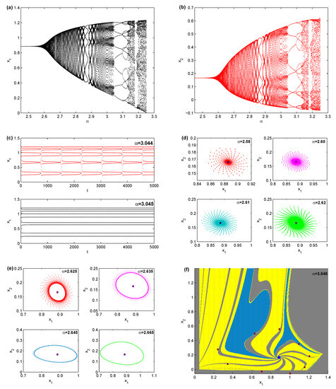 whose eigenvalues are and . They are real and their absolute values lie within the open circle and hence is locally asymptotically stable. In addition, it is easy to see that the conditions of stability (15) are satisfied. The numerical experiments show that is stable for the values of . At the period two-cycle is born. Figure 1a presents the kind of bifurcation by which the equilibrium point becomes unstable. It is a period-doubling bifurcation. As one can see, increasing the parameter gives rise to period 4-cycle, 8-cycle and other higher period cycles, then routes to chaotic behaviors of the map arise around equilibrium point. Globally, at and the other parameter values are kept fixed as previously, we get only the stable equilibrium point. It is plotted with its basin of attraction in Figure 1b, where the grey color denotes divergent and unfeasible trajectories. Increasing further gives a quite complicated phase plane. The stable period 2-cycle continues to appear as increases and then the period 4-cycle arises at . Figure 1c shows the basin of this 4-cycle (represented by squares) with the equilibrium point (represented by circle). The yellow and orange colors characterize the basin of attraction of this cycle. As increases the basin becomes more complicated. The nonlinearity of map (10) gives a consequence of multistability and hence the basin becomes complicated. Keeping the other parameter values fixed and take a stable period 8-cycle and its basin emerged with the equilibrium point in Figure 1d. Higher periodic cycles appear as increases and then at chaotic attractors are born. Figure 1e,f show two-piece chaotic attractors of the map (10) around the equilibrium point and the time series for both variables, respectively.