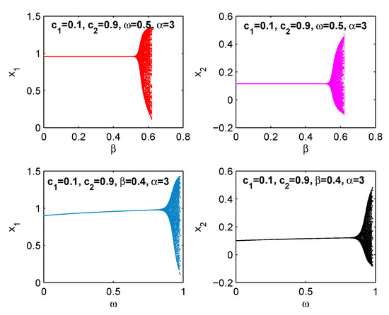 From the previous discussion, we remark that the main feature of the map (10) is that its dynamic becomes complicated due to two different types of bifurcations. Those types are period-doubling and Neimark–Sacker bifurcation. Because the map has five parameters and the equilibrium point has a complicated expression, it is hard to put a clear form for the stability conditions (15). Instead, we have performed some numerical simulation which has provided some insights about the map’s dynamics. We have observed that the bifurcation parameter yielded chaotic behavior of the map due to period-doubling bifurcation when we took small values of the first firm’s cost , compared with those by the other firm (), besides the small value of . Indeed, the second equation of (10) contains three important parameters that are , and . In the previous discussion, we have kept those parameter values fixed and studied the influences of . It shows that the map’s equilibrium point becomes unstable due to Neimark–Sacker bifurcation when as shown before. Furthermore, a mixed scenario is detected for the map’s dynamic which is due to the two types of bifurcations. It is observed above that after the Neimark–Sacker bifurcation, there were some periodic windows which lead the map’s dynamics to change from quasi-periodic motion to periodic motion. We conclude this section by giving the impact of the other parameters and on the map’s dynamics in the following figure. Figure 4 shows that the map’s fixed point becomes unstable because of Neimark–Sacker bifurcation on varying the parameters and keeping the other parameters’ values at and . The discussion carried out so far reveals that the map’s dynamic are quite complicated. This is clear from the shape of basins of attraction and the corresponding trajectories obtained above. Therefore, getting more insights into the map’s trajectories lets us take into consideration two important features of the map (10). The first one is that the map is a noninvertible map, as will be discussed in the next section. Secondly, the map has one of its components (the denominator of the first equation in (10)) vanishing at .