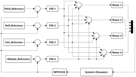 In Figure 2 the signals are denoted as follows: r(k) is the reference signal at current iteration k; c(k) represents the control signal at this current iteration k; y(k) is the output of the system, measured by sensors at iteration k; e(k) is the error signal at iteration k; Kp, Ki, and Kd represent the proportionality, integration, and derivation constant, respectively. Regarding the angular velocities of the motors, it is necessary to ensure that they behave according to the control signals received from the angular position and altitude controllers. In view of the microcontroller’s processing capacity and the relatively large dimensions of the program used to obtain the inclination angles and the control law previously determined, four electronic speed control modules (ESCs) will be used to control the angular velocities of the motors.
