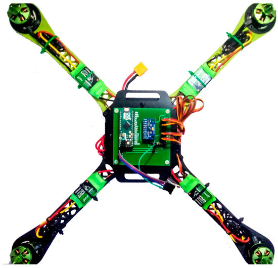 The main aspects of the flight apparatus described in this work are defined by: the number of engines, the position of the support arms, the mass and the center of gravity of the whole assembly. The arms are mounted in “X,” to allow easy change of direction, and the center of gravity is fixed at the intersection of the axes of the arms. The change of direction is facilitated by the control of the angular velocity of the engines. The motors are positioned as follows: two motors on one diagonal are rotated in the same direction, while the remaining two motors on the other diagonal rotate in the opposite direction. Viewed as a whole, the system is composed of a four-arm flight apparatus mounted in “X” and a remote control that provides references to the control circuit located on the quadrotor. They communicate via the UART protocol, using two RF transmission and reception modules. Two-way data exchanges are made between the quadrotor and the remote control, so both items send data and await receipt.