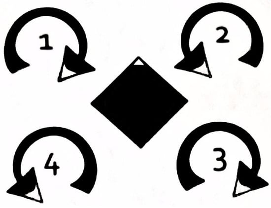 Figure 3 presents the resulted low-cost quadrotor UAV. It has four motors controlled by electronic speed controllers rotating as described in Figure 4. Each motor is mounted on a plastic arm, which in turn is attached to the carbon fiber central structure. All pieces were chosen so that the assembly has the lowest weight and, at the same time, to maintain the condition of the center of gravity described in the previous section.