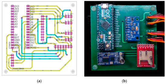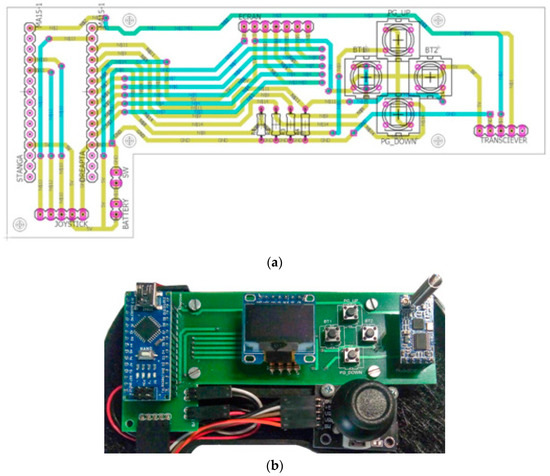 The wiring diagram and the implemented UAV system are presented in Figure 7. The corresponding remote controller schemes are in Figure 8, where (a) represents the wiring diagram designed in Eagle, while (b) is the implemented circuit.