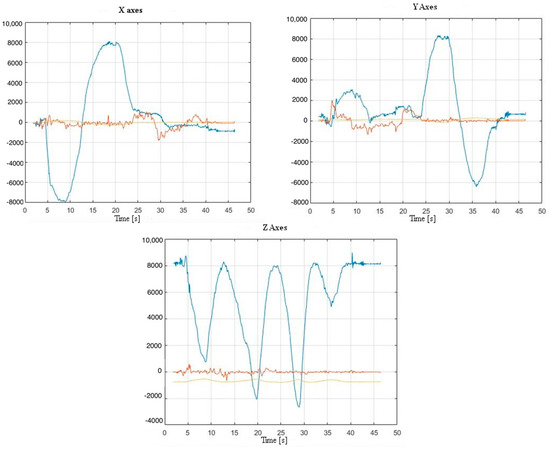 Measurements were realized without using the developed estimator. Figure 9 presents the raw results of the gyroscope, accelerometer and magnetometer for a linear movement. It can be concluded that in the case of noisy signals, such an approach is not usable in a feedback control structure. It is obvious the necessity of the estimator.