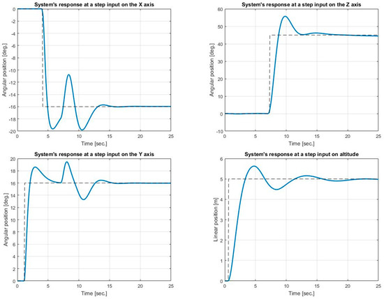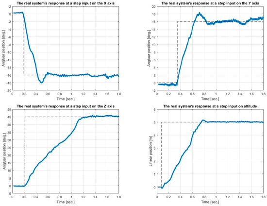 The designed control algorithms were also implemented on the microcontroller. The obtained results in the worst-case scenario, windy conditions, are plotted on Figure 12, presenting the response of the closed loop system to a step reference on each of the four directions of movement.