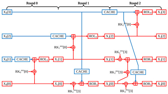 - Round 1 However, due to the Round 0, the X[1] word is also beginning to be affected by the counter value. For this reason, it might be thought that the precomputation part is only available at X[2] word. The part where X[3] word is used as the input value of X[0] in Round 1 can be expressed by the following equation:At this equation, it can be seen that the blue parts X[3] word and round key are fixed values. Consequently, XOR instruction between X[3] word and round key part can be skipped.