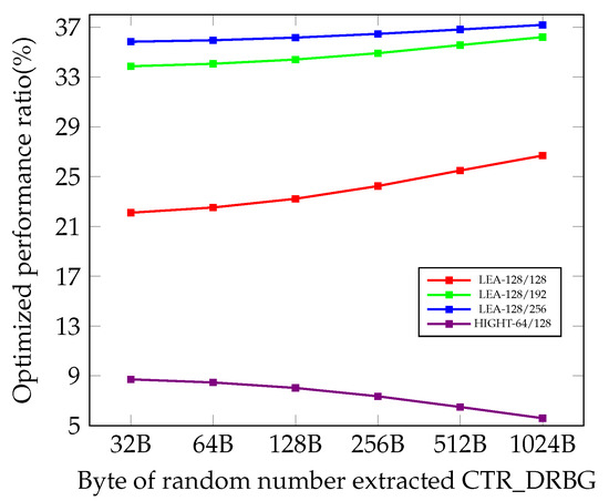 - Proposing optimization methods that can be applied to various platformsIn this paper, we propose general optimization methods for ARX-based block ciphers using the CTR mode. These methods have the advantage to be extended to other Addition-Rotation-XOR (ARX) based ciphers such as CHAM, Simon, and Speck [8,9]. While the significance of DBRG is increasing with the advent of the IoT era, there have been a few academic papers on optimization for CTR_DRBG that are popular to use. In this paper, we present CTR_DRBG optimization methods on 8-bit AVR Microcontrollers, the most limited IoT device. Our work is meaningful as it is the first attempt to optimize CTR_DRBG. Furthermore, our proposed Korean block cipher optimization methods and CTR_DRBG optimization methods are not only applicable to 8-bit AVR Microcontroller, but also to other low-end-processors and high-end-processors such as 16-bit MSP430, 32-bit ARM, and the CPU environment.