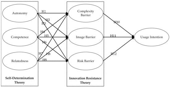 This study integrated two theories, innovation resistance theory, proposed by Ram and Sheth [20], and self-determination theory, posited by Deci and Ryan [62]. It explored consumer’s usage intention with regard to mobile payment by combining these two theories. The proposed research model is shown in Figure 1.