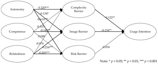 Thus, this study posits that competence has a negative impact on the risk barrier to innovation. Personal competence is also considered to be influential in the perceived image of products or services [56]. When a person with a higher level of competence is seen to have adopted an innovation, this may produce a stronger perceived image of a low-quality product or poor service.