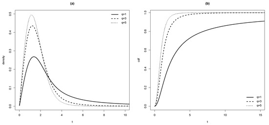 (a) pdf and (b) cdf in SMR model for and different values of q.