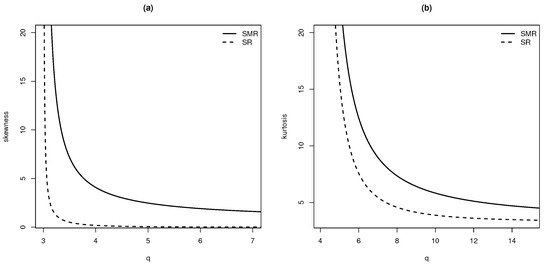 Figure 2 shows the plots for the asymmetry, (a), and kurtosis, (b), coefficients for SMR and SR models. We highlight that both coefficients are much higher for the SMR distribution than the ones for the SR model. That means that SMR distribution is more flexible with respect to the asymmetry and kurtosis than SR model.