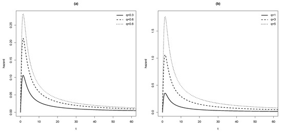 Plots of are given in Figure 3 for and in (a) and in (b). In both settings, we note that the peak increases with q.